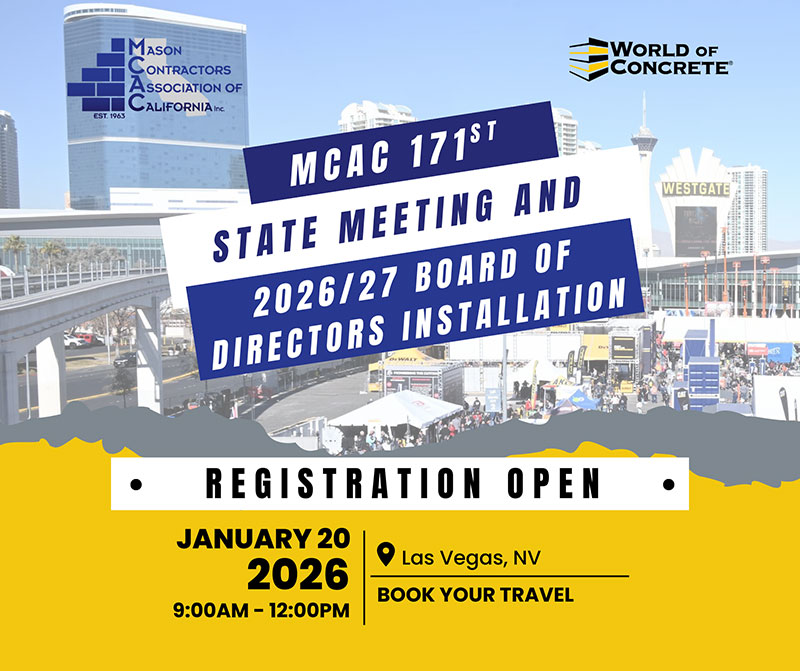 Attendees will hear how one of the nation’s most successful workforce development models is reshaping the trades; get up to speed on the latest laws and regulations impacting masonry businesses in 2026 and learn how the California Masonry Council is elevating masonry design awareness across the A/E/C industry. It’s a powerful mix of education, advocacy, and real-world strategy you won’t want to miss!
